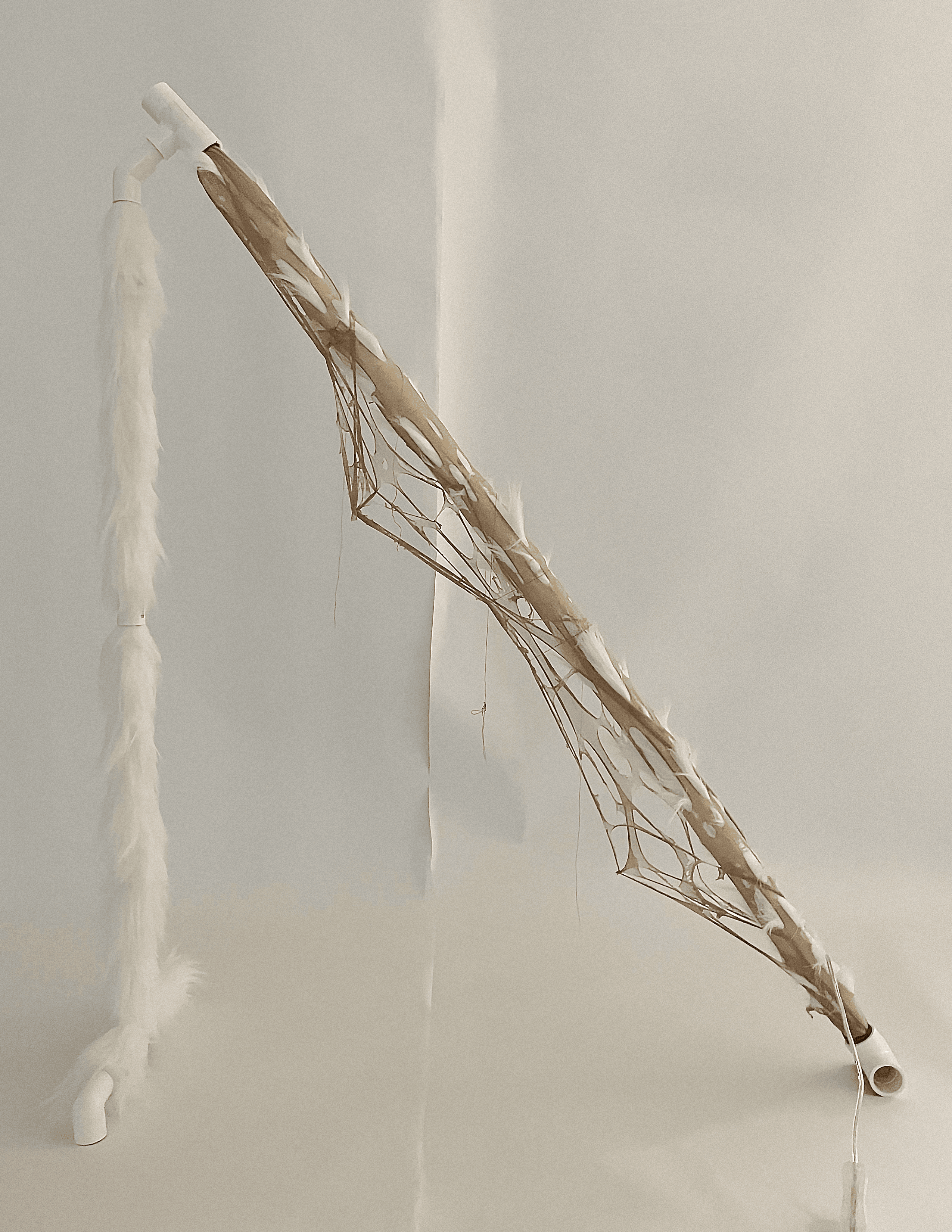 Light constructed from LED Tube, faux fur, nylon stocking, PVC Piping.